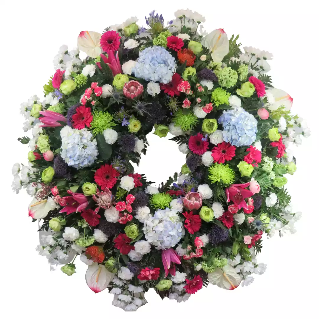 Corona de Hortensias, Gerberas, Liliums y Anthuriums